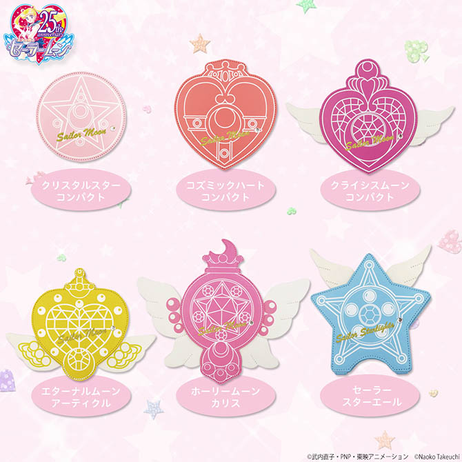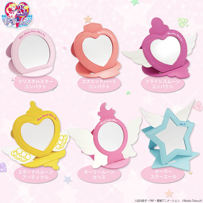Składane lusterka w formie magicznych przedmiotów. Do wyboru: Crystal Star Compact (14 x 14 cm), Cosmic Heart Compact (17 x 15,5 cm), Crisis Moon Compact (18 x 26 cm), Eternal Moon Article (17 x 23 cm), Holy Moon Chalice (23 x 18 cm) oraz Sailor Star
