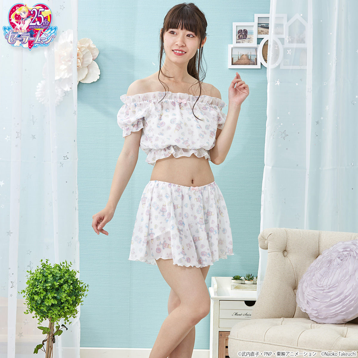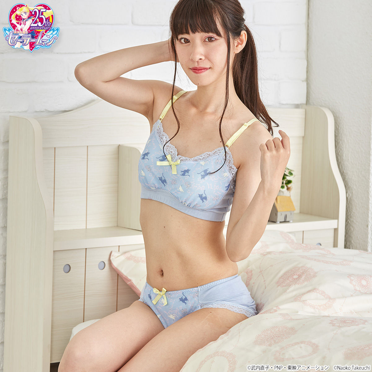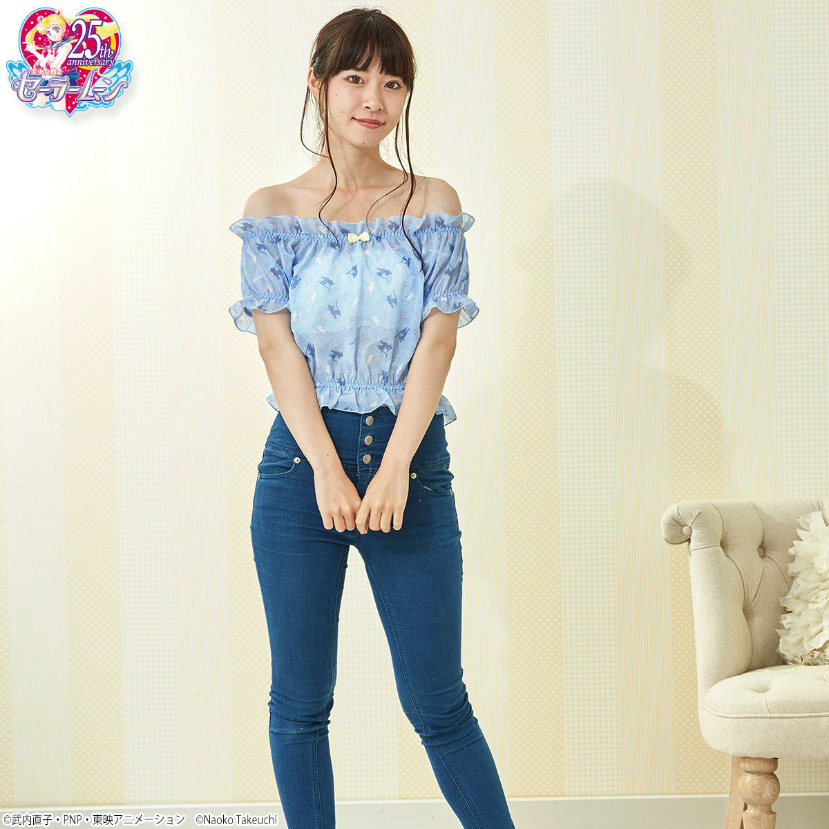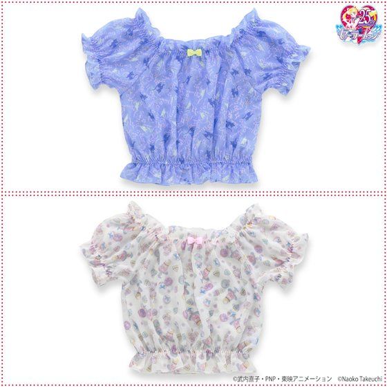 Zestaw biustonosz z szortami - dostępny tylko w kolorze niebieskim; 5720 jenów (ok. 202 zł) za zestaw. Top z odsłoniętymi ramionami i marszczeniami - pod szyją mała kokardka; 4400 jenów