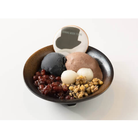 Tuxedo Black Sesame Sundae - pudding sezamowy z lodami czekoladowymi i z czarnego sezamu; ozdobione lukrowanym ciastkiem z wizerunkiem cylindra; 1500 jenów (ok. 53 zł); w zestawie oryginalny talerz.