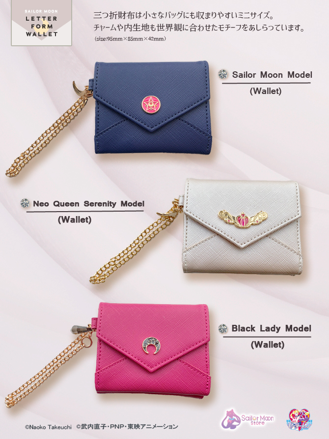 W Sailor Moon Store pojawią się kopertowe portfele i etui na karty. Z każdego artykułu dostępne będą trzy modele do wyboru: Sailor Moon, granatowy z broszką Crystal Star; Neo Queen Serenity, biały z diademem Królowej oraz Black Lady, różowy z odwróconym