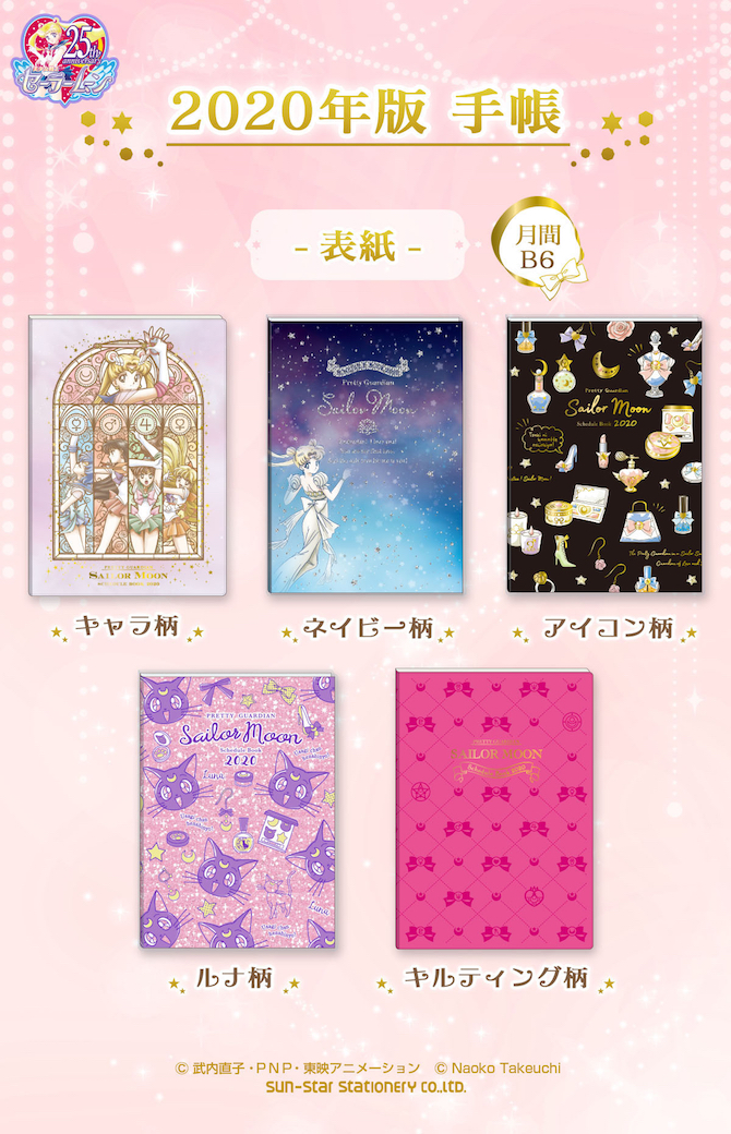 Jeszcze w tym miesiącu pojawią się notatniki z kalendarzem na 2020 rok. Do wyboru jest 5 wzorów: witrażowy, z Księżniczką Serenity, z bibelotami, z Luną i pikowany. Wzór witrażowy ma inner senshi z przodu i resztę wojowniczek z tyłu, winylową okładkę