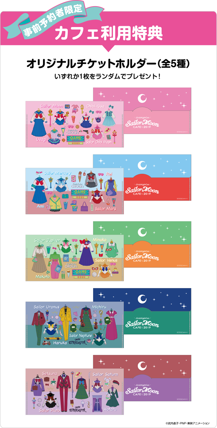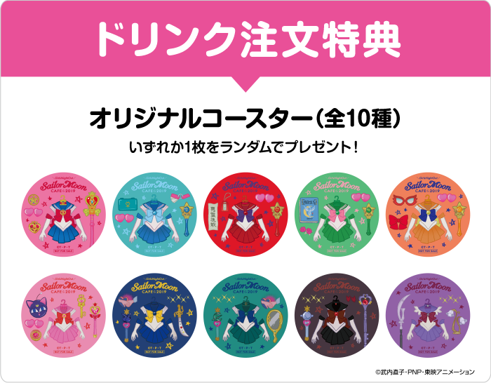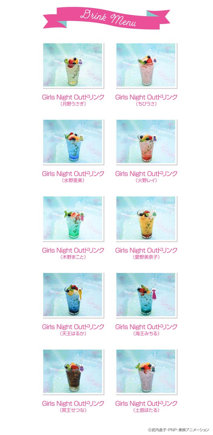 Girls Night Out Drink - dostępne 10 smaków inspirowanych inner senshi, outer senshi i Chibiusą; Usagi - morela i piwo imbirowe; Chibiusa - mleko truskawkowe z dodatkami; Ami - curacao i kokos; Rei - czarna porzeczka i granat; Mako - mięta i cytryna; Minako - czarna porzeczka i sok pomarańczowy; Haruka - curacao i napój winogronowy; Michiru - curacao i napój miętowy; Setsuna - kokos i cola; Hotaru - mleczny napój winogronowy; 961 jenów (ok. 36 zł) za sztukę.