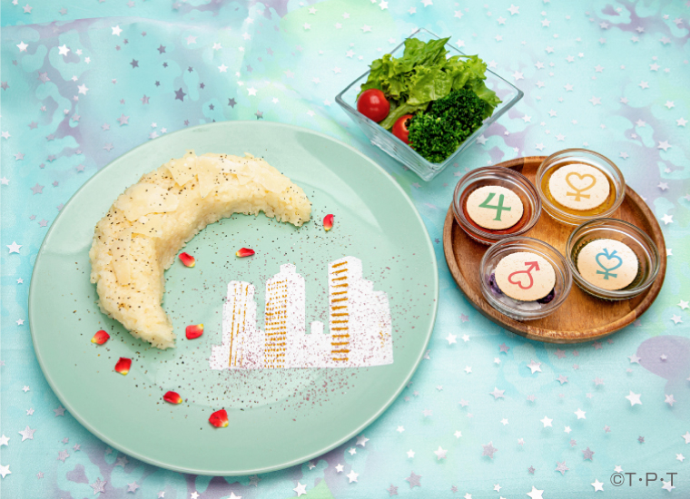 - Moonlight Risotto - serowe risotto ułożone w kształt księżyca na talerzu ze wzorem budynków, dzięki czemu wygląda jak nocna panorama miasta; w zestawie 4 sosy inspirowane Mercury, Mars, Jupiter i Venus; 1609