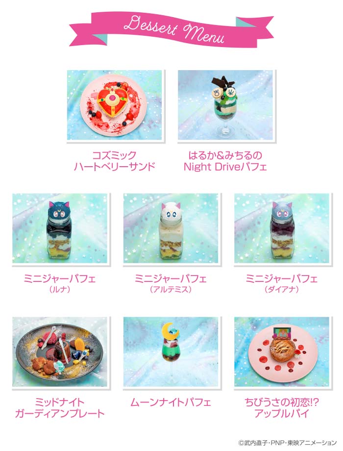 - Mini Jar Parfait (Luna, Artemis i Diana) - desery w słoikach powiązane tematycznie w Luną, Artemisem i Dianą; Luna jest z lodami waniliowymi i galaretką winogronową, Artemis z brzoskwiniowym tofu, a Diana