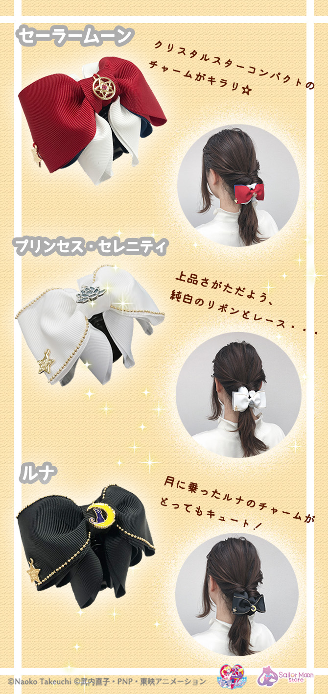 W oficjalnym sklepie pojawią się spinki-grzebyki z kokardami do włosów. Do wyboru są 3 wzory: biało-czerwono-granatowy "Sailor Moon" z broszką Crystal Star, biały "Księżniczka Serenity" ze Srebrnym Kryształem oraz czarny "Luna"