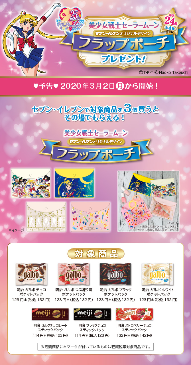 Drugiego marca rozpocznie się w sieci sklepów Seven Eleven kampania we współpracy z Sailor Moon. Przy zakupie trzech czekolad firmy Meiji (z siedmiu wybranych) otrzyma się saszetkę zapinaną na zatrzask. Do uzbierania są cztery wzory.