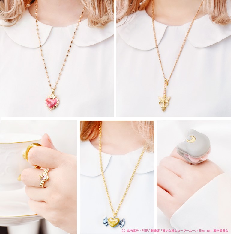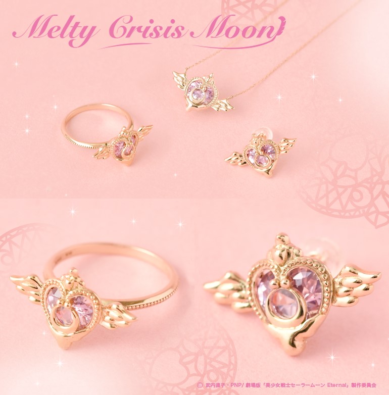 Melty Crisis Moon - naszyjnik, pierścionek i kolczyki z broszką Crisis Moon Compact; naszyjnik kosztuje 38500 jenów (ok. 1482 zł); pierścionek dostępny jest w rozmiarach 9 i 11 i kosztuje 46200 jenów (ok. 1779 zł), a kolczyki 30800 jenów (ok. 1186 zł).