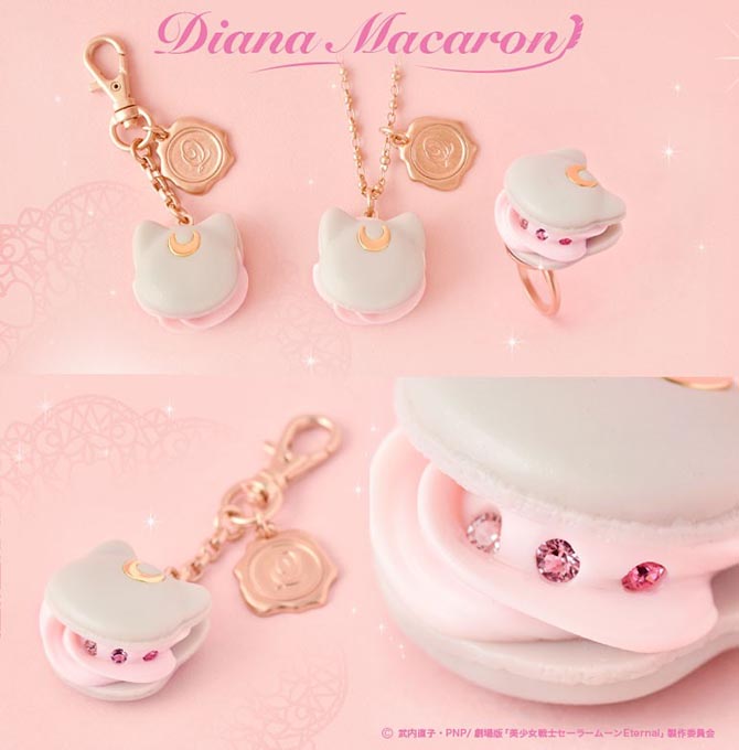 Diana Macaron - zawieszka, naszyjnik i pierścionek z makaronikiem inspirowanym Dianą; zawieszka kosztuje 8250 jenów (ok. 318 zł), naszyjnik 10450 jenów (ok. 402 zł), a pierścionek 7150 jenów (ok. 275 zł).