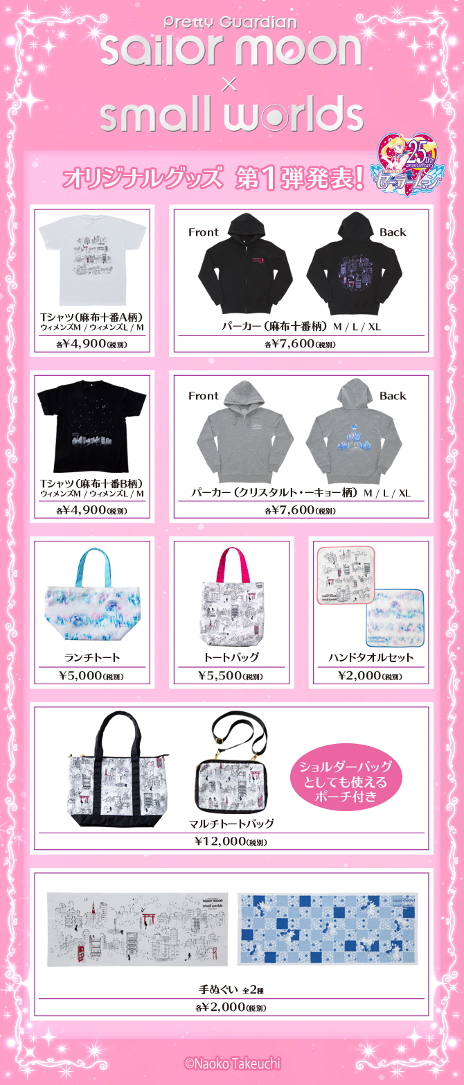 Bluzy z kapturem - czarna ze wzorem Azabu Juuban oraz szara ze wzorem Kryształowego Tokio; dostępne rozmiary to M, L i XL; 8360 jenów (ok. 317 zł) za sztukę.