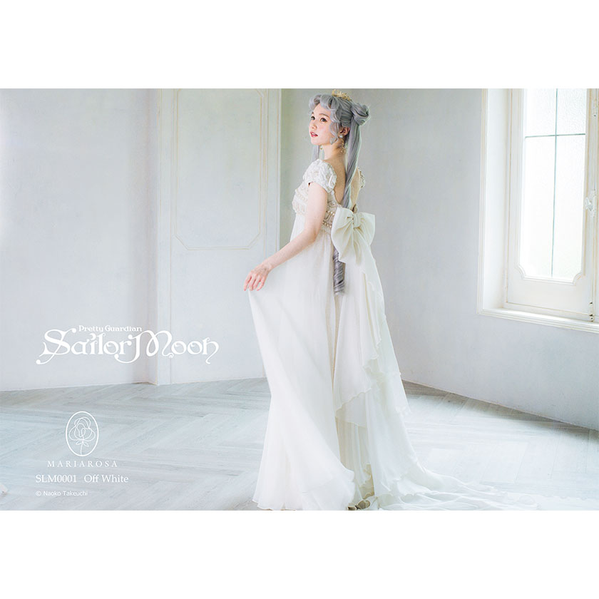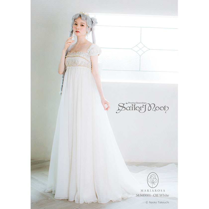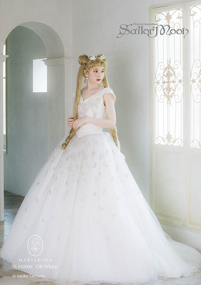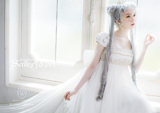 Model Sailor Moon - sukienka dwuczęściowa; na wierzchnim materiale znajdują się błyszczące znaki planet inner senshi; suknię można nosić w samej bieli lub założyć dodatkową nakładkę inspirowaną Sailor Moon, która imituje strój wojowniczki; peruka, ozdoby