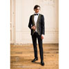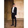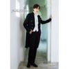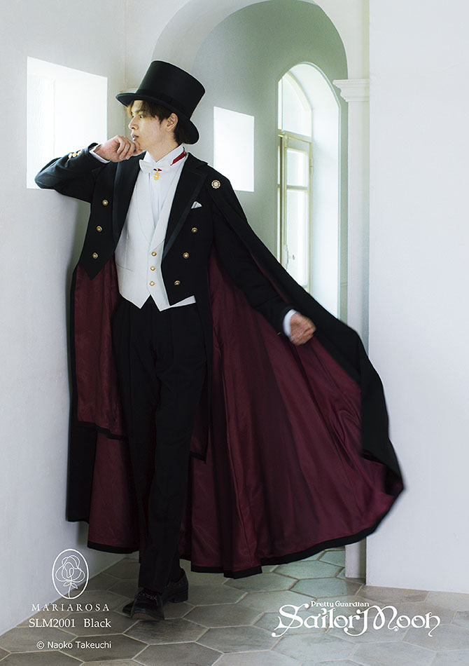 Model Tuxedo Kamen - garnitur Tuxedo Kamen; wykonany z błyszczącego materiału; peleryna i cylinder to opcjonalne dodatki, również możliwe do wypożyczenia.