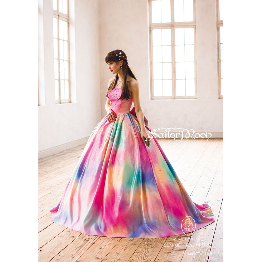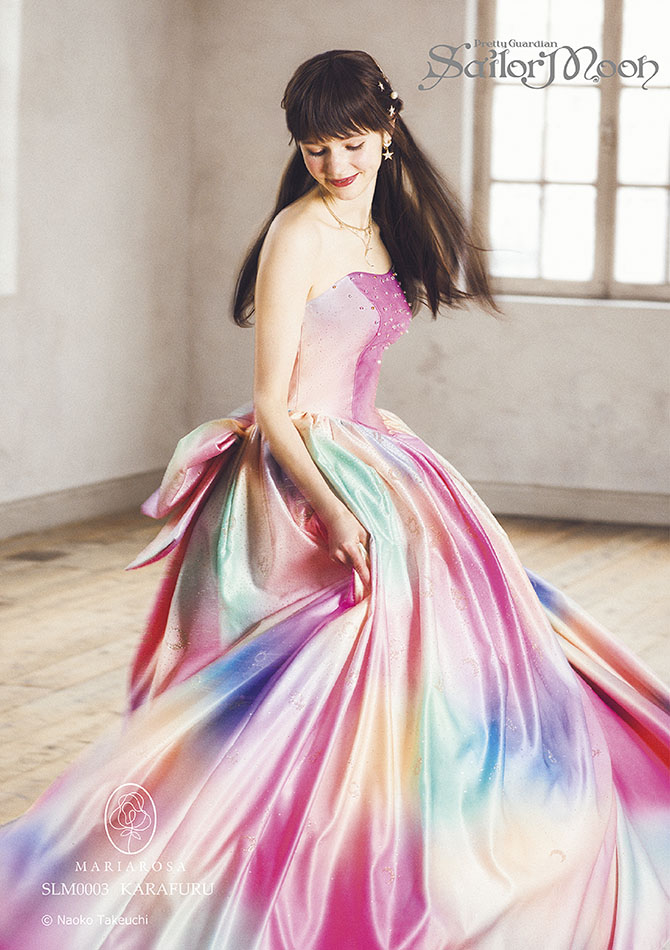 Suknia inspirowana inner senshi i Sailor Chibi Moon - kolorowa sukienka, na której jedne kolory przechodzą w drugie; wierzch ozdobiony błyszczącymi znakami planet; biżuteria i ozdoby do włosów również możliwe do wypożyczenia.