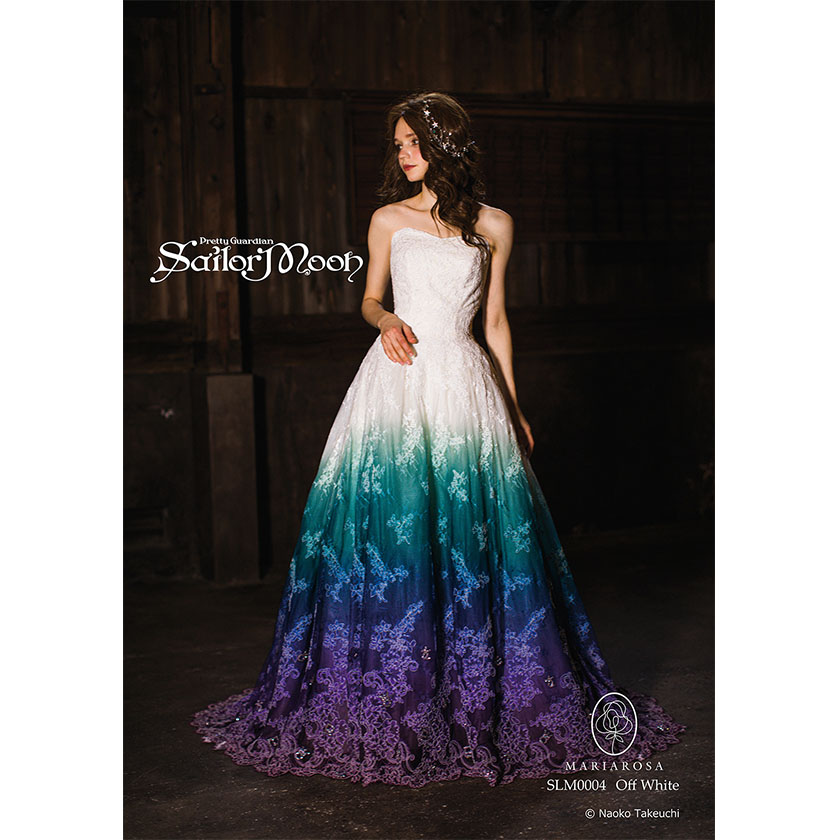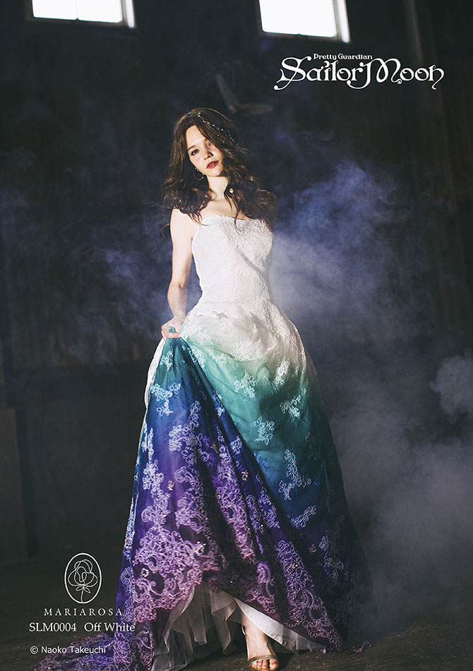 Suknia inspirowana outer senshi - góra sukni jest biała, a dół cieniowany w kolorach outer senshi; opcjonalnie można wypożyczyć biżuterię i akcesoria do włosów.