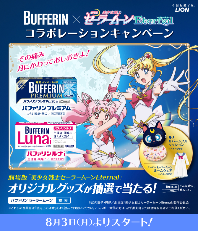 Od 3 sierpnia kampanijne reklamy pojawią się na YouTubie, Instagramie, Twitterze oraz na stacjach kolejowych w Tokio. W reklamach pojawi się Super Sailor Moon oraz piosenka Moonlight Densetsu. Reklamowane będą Bufferin Premium i Bufferin Lunai.