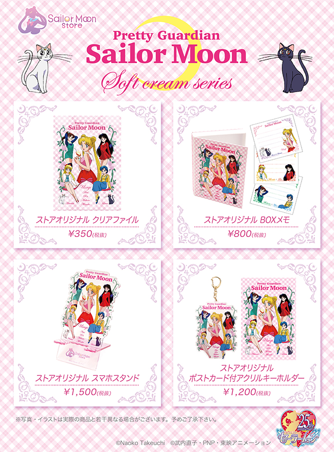 W Sailor Moon Store i Pretty Guardians w serii Soft Cream pojawią się obwoluta, notes, stojak na smartfona oraz zestaw brelok z pocztówką. Na artykułach grafika z inner senshi w strojach codziennych. W sprzedaży pojawią się w sierpniu.