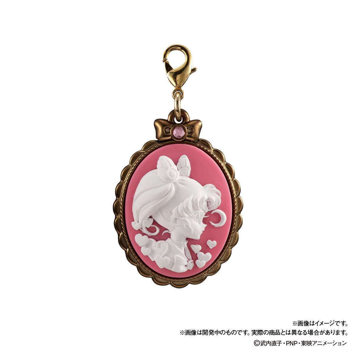 służący do dopinania do torebki, ozdobiony perełkami i kryształkami. Do łańcuszka będzie można dopinać wybrane przez siebie kamee. W zestawie znajdują się kamee z Sailor Moon, Tuxedo Kamen, Sailor Mars, Sailor Mercury, Sailor Venus,
