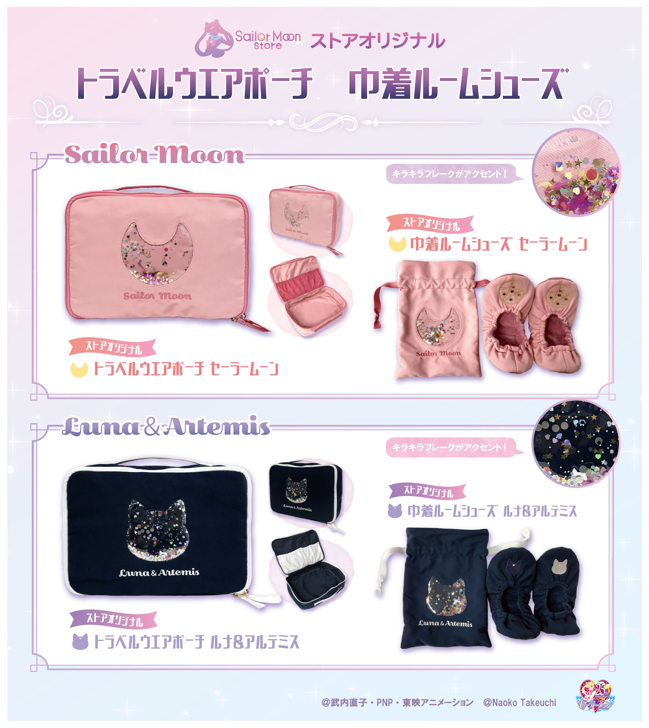 W Sailor Moon Store, Sailor Moon Store Petit oraz Pretty Guardians pojawią się podróżne kosmetyczki i składane kapcie chowane w woreczku. Oba artykuły dostępne są we wzorach Sailor Moon oraz Luna & Artemis. Kosmetyczki i woreczki na kapcie mają okienka