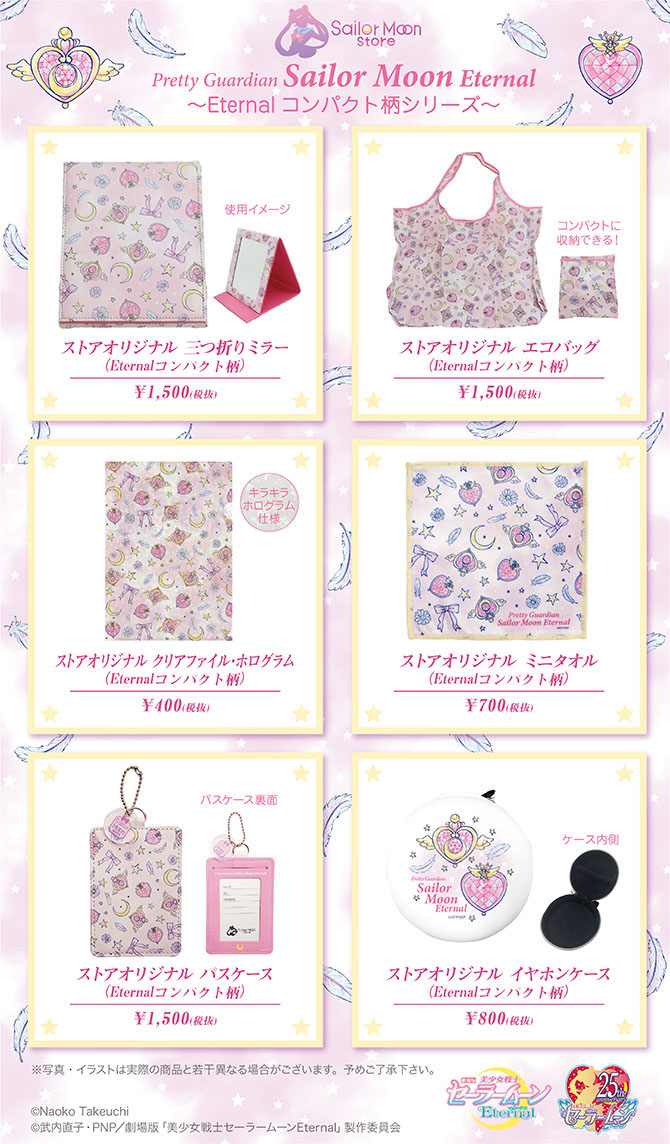 W Sailor Moon Store pojawią się artykuły z. wzorem z broszkami z filmu Eternal. Do wyboru będą lusterko, torba na zakupy, holograficzna obwoluta, mini ręcznik, etui na kartę/identyfikator/itp. oraz etui na słuchawki. W sprzedaży pojawią się w połowie