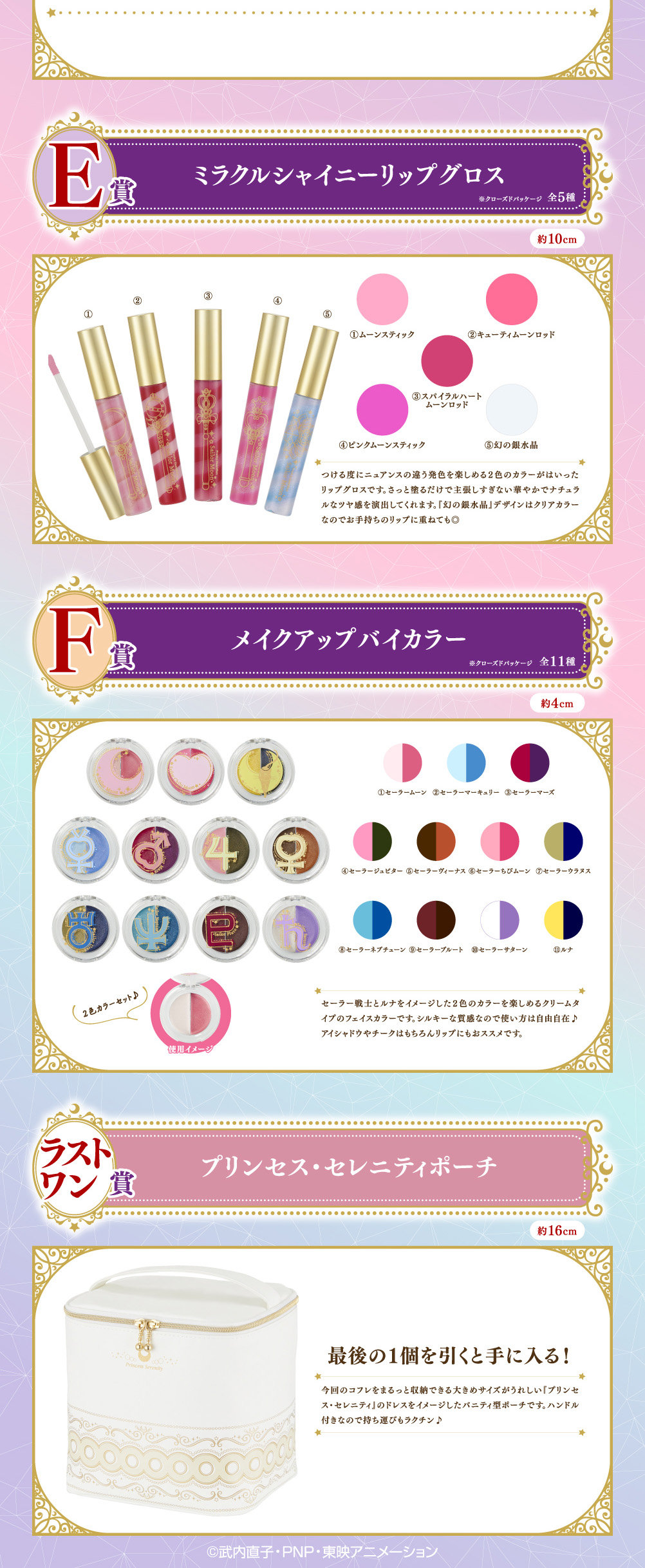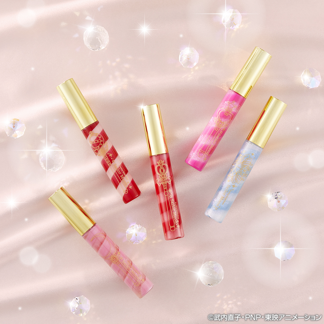 E - dwukolorowe błyszczyki do ust, na opakowaniu wzory pałeczek i bereł Sailor Moon i Sailor Chibi Moon oraz Srebrnego Kryształu, ostatni błyszczyk jest przezroczysty i można go nakładać na szminkę w celu podkreślenia jej koloru. F