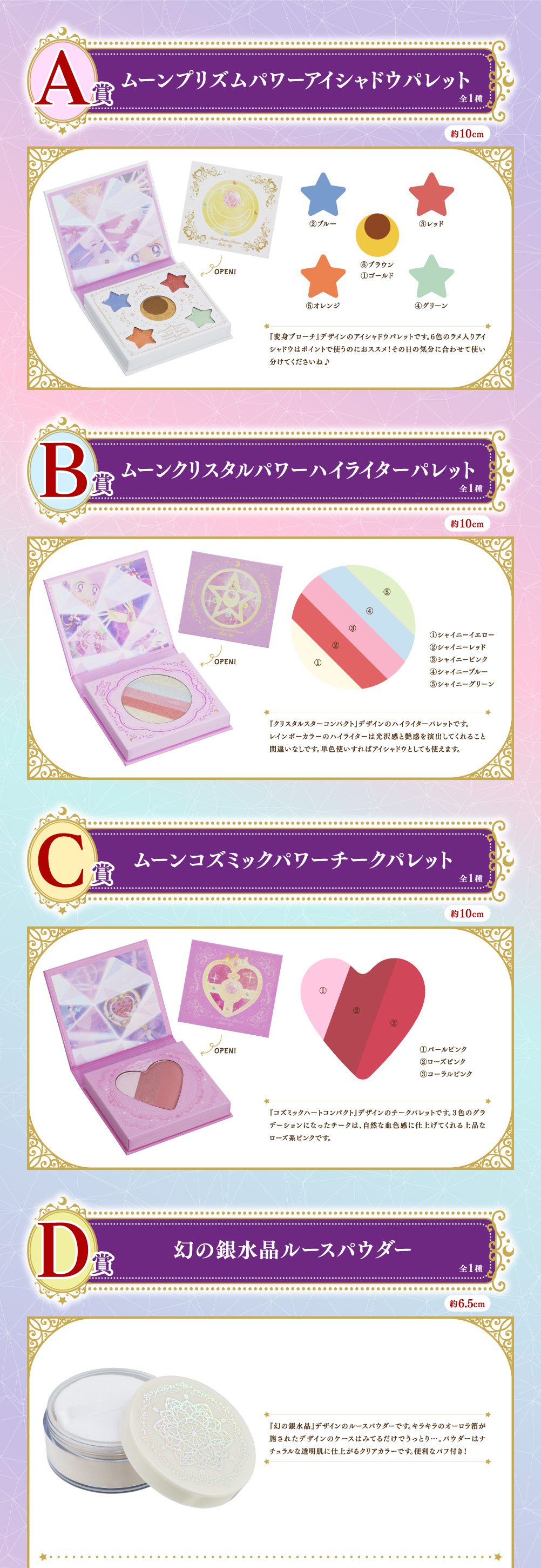 Zestaw, w skład którego wchodzą Super Sailor Moon, Super Sailor Chibi Moon i Helios, będzie sprzedawany w automatach gashapon oraz w sklepach stacjonarnych. W sklepach figurki pojawią się w dodatkowych kapsułkach zabezpieczonych nieprzezroczystą folią