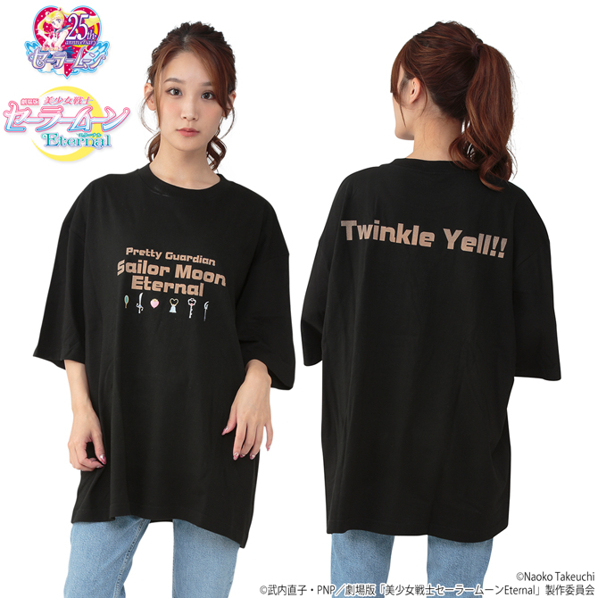 Moon Crisis Make Up. Na czarnej znajdują się magiczne przedmioty outer senshi, a na placach napis Twinkle Yell. Dostępne rozmiary to S, M, L i XL. Przedsprzedaż rozpoczęła się 1 października i będzie trwać do 9 listopada, a wysyłka