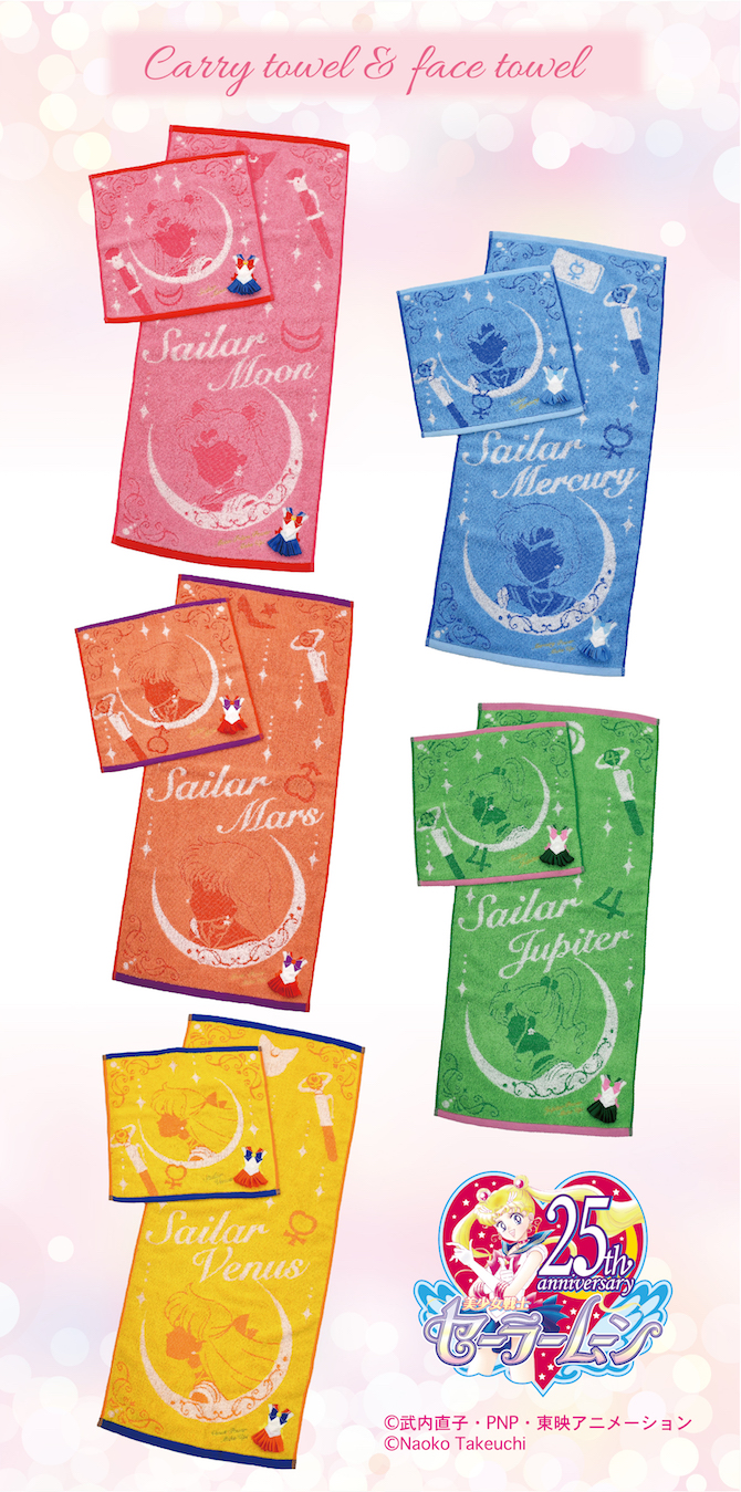 Ręczniki inspirowane inner senshi. Na ręcznikach pojawią się głowy inner senshi oraz ich magiczne przedmioty, do wyboru 5 wzorów, każdy z inną wojowniczką. Z każdego wzoru dostępne będą dwie wielkości: mini ręcznik 30 x 30 cm oraz ręcznik do twarzy 34