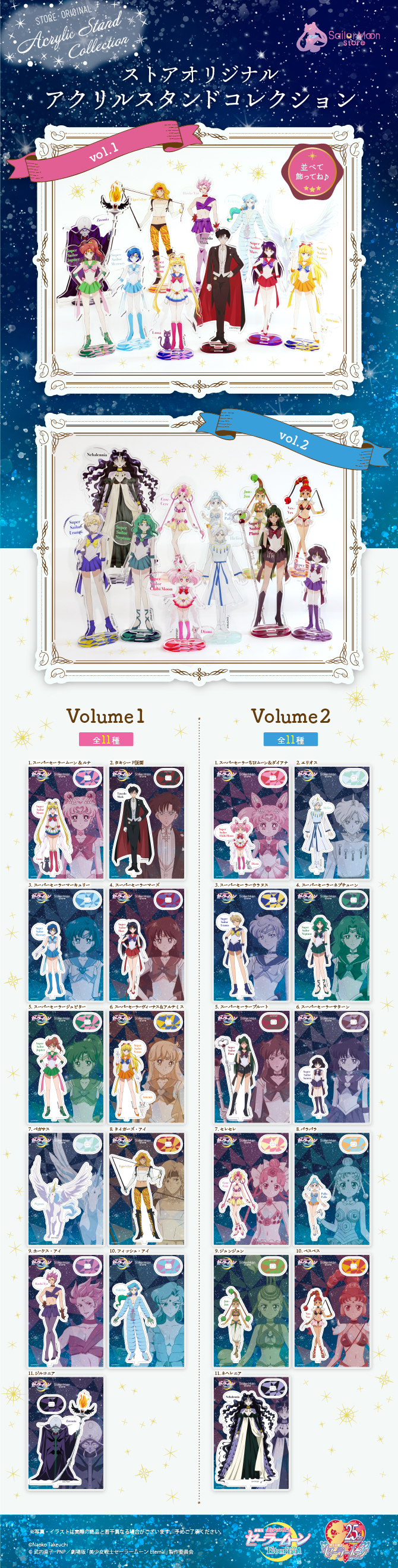 W Sailor Moon Store pojawią się akrylowe ozdoby z wojowniczkami i wrogami z filmu Eternal. Całość została podzielona na dwie części po 11 sztuk. Pierwsza część będzie zawierać: Moon, Tuxedo Kamen, Mercury, Mars, Jupiter, Venus, Pegaza, Tigers Eye, Fish