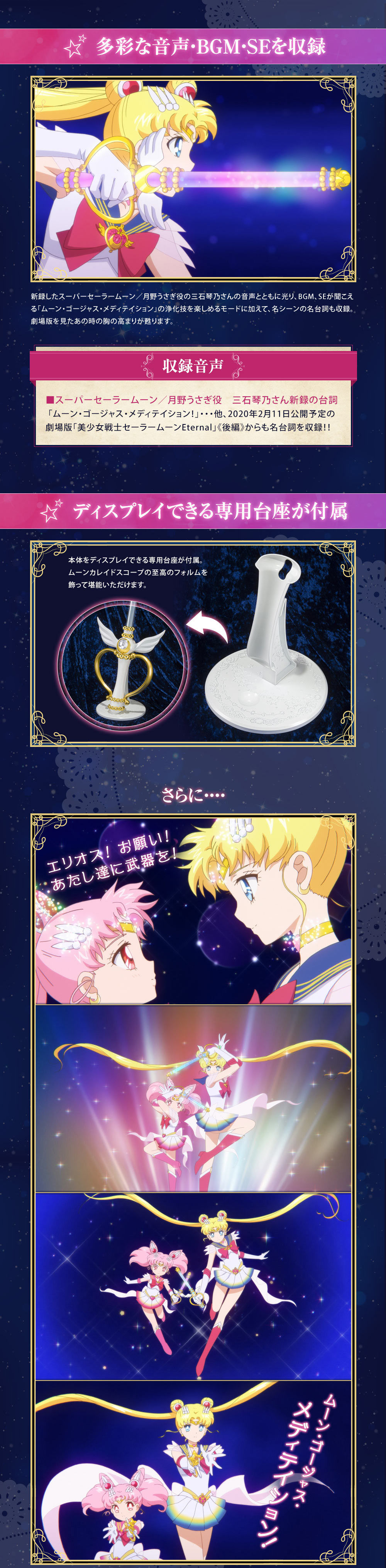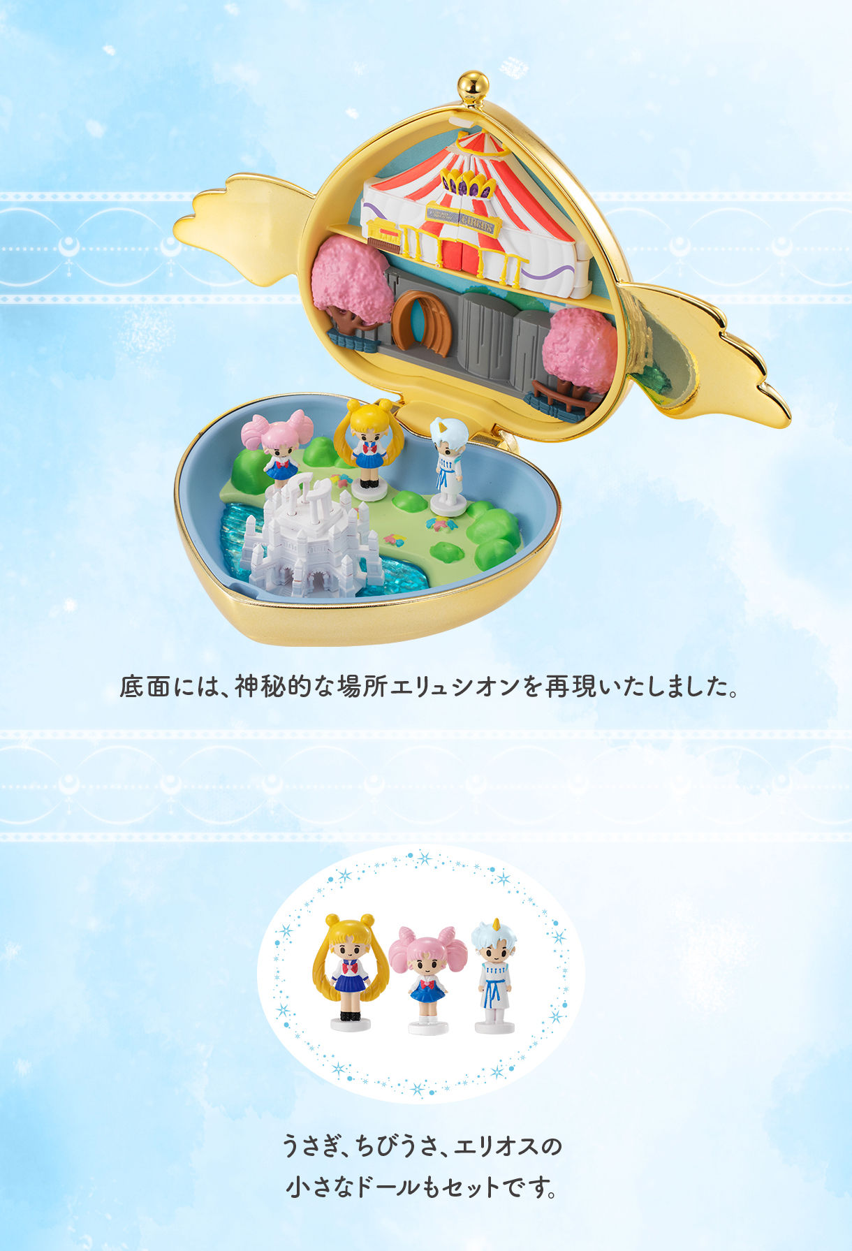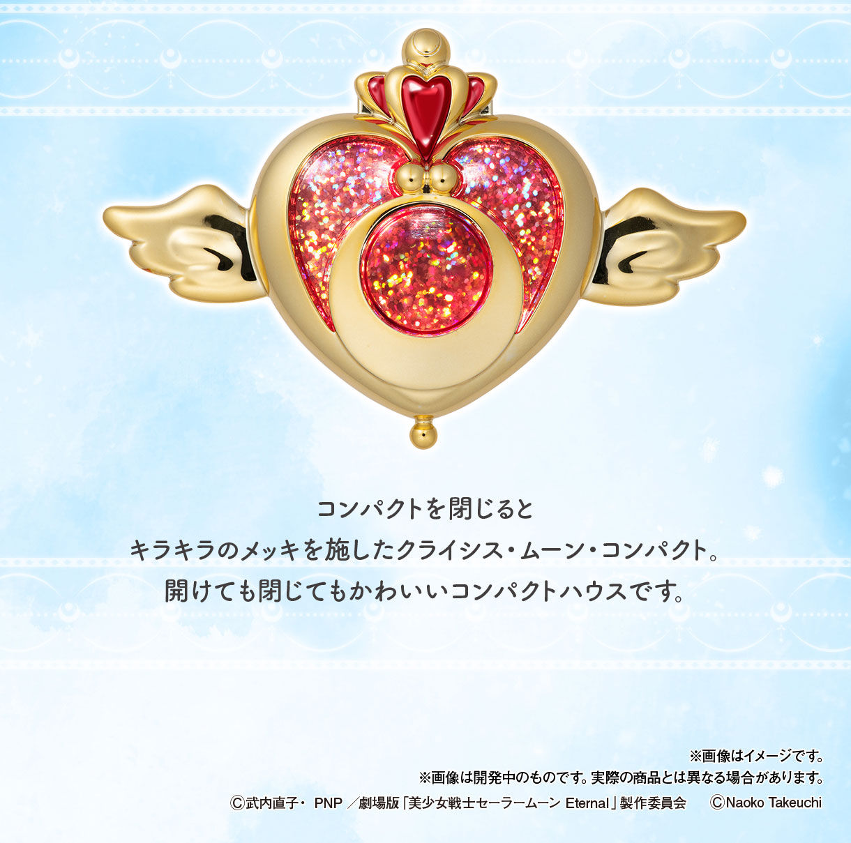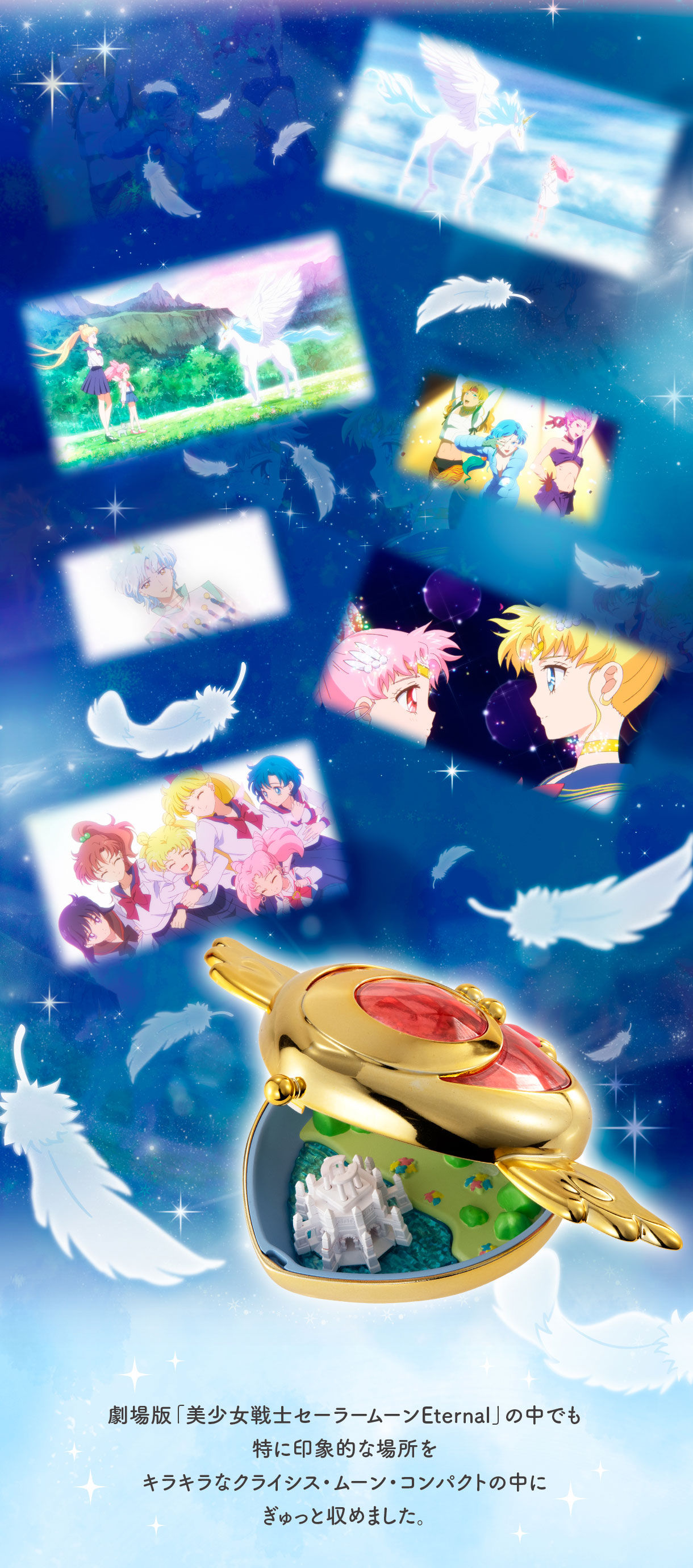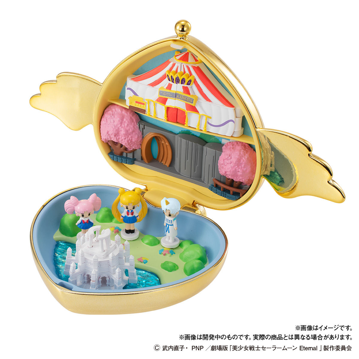 Pojawi się kolejna diorama-miniaturka w broszce, tym razem będzie to broszka Crisis Moon Compact, w której pojawią się lokalizacje związane z filmem Eternal. W środku znajdzie się Park Ichinohashi, namiot Cyrku Martwego Księżyca oraz Elizjum. W zestawie