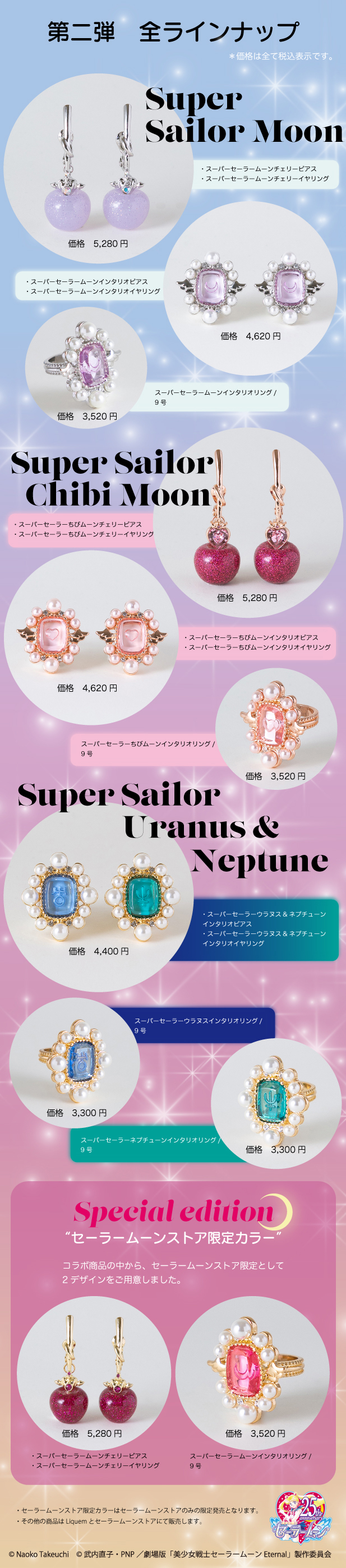 Ring - pierścionek tworzący komplet z kolczykami powyżej; do wyboru z niebieskim lub zielonym oczkiem; rozmiar 9; 3520 jenów (ok. 127 zł). Special Edition (sprzedawane jedynie w Sailor Moon Store): Super Sailor Moon Cherry
