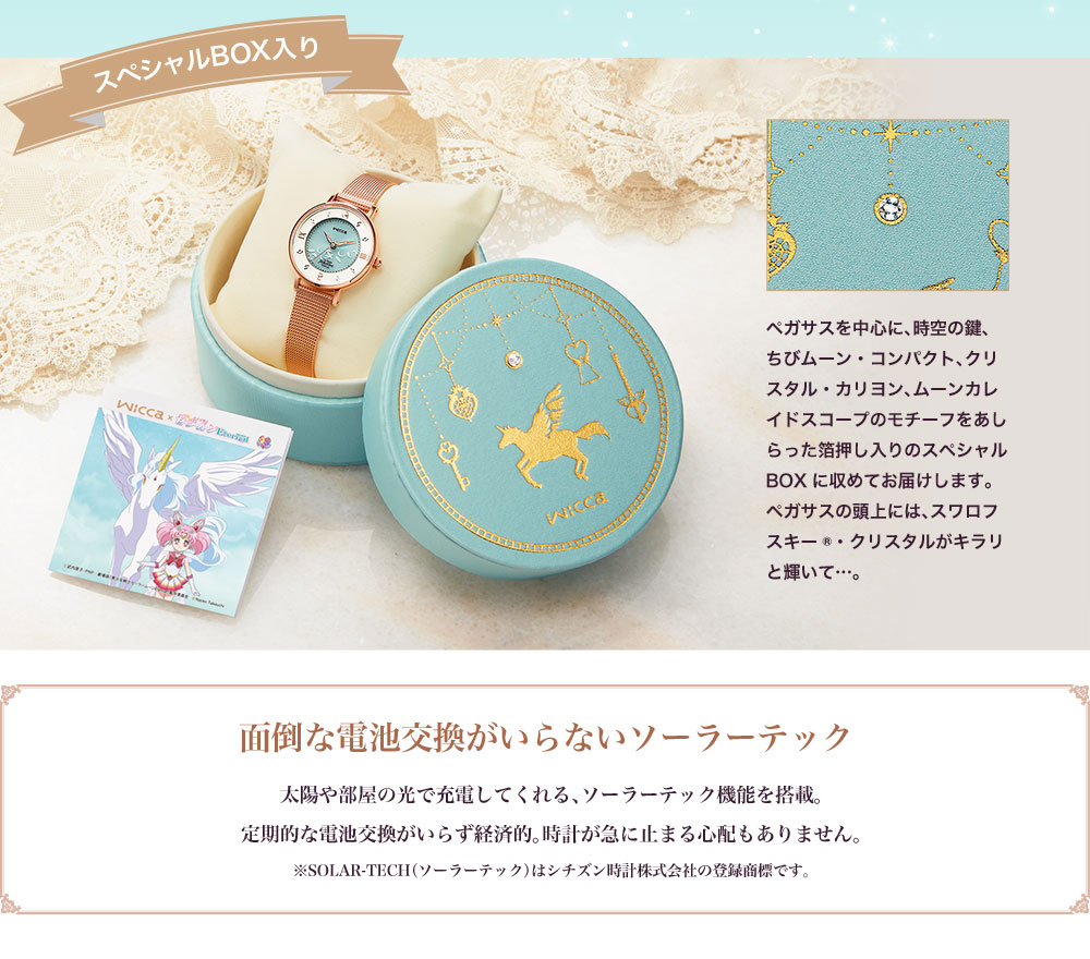 okrągłe ozdobne pudełko. Wieczko pudełka ozdobione jest wytłoczeniem ze złotej folii oraz kryształkiem Swarovskiego. Przedsprzedaż rozpoczyna się dzisiaj na stronie Premico, wysyłka nastąpi w lutym. Zegarek kosztuje 32 780 jenów (ok.