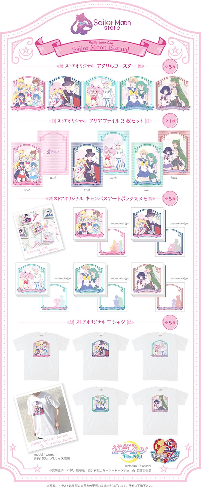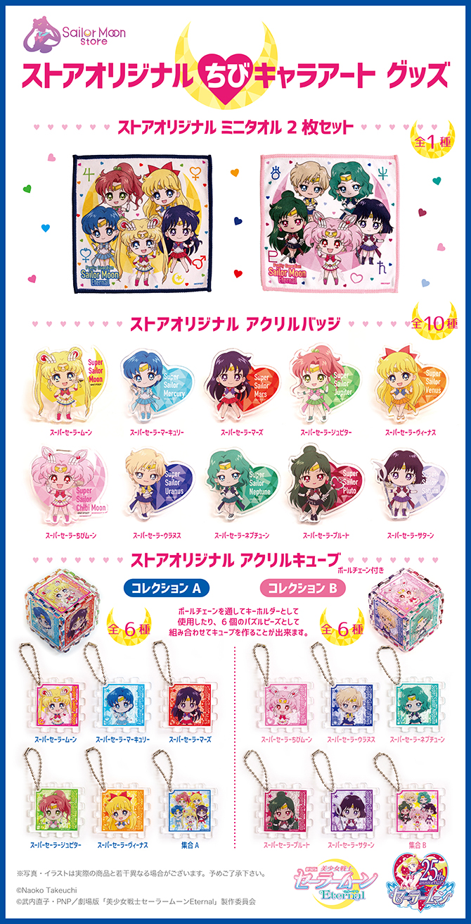 W Sailor Moon Store i Pretty Guardians pojawią się kolejne gadżety związane z filmami Eternal. Na wszystkich produktach pojawia się 5 wzorów: inner senshi, Sailor Moon i Tuxedo Kamen, Sailor Chibi Moon i Helios, Uranus i Neptune oraz Pluto i Saturn. W