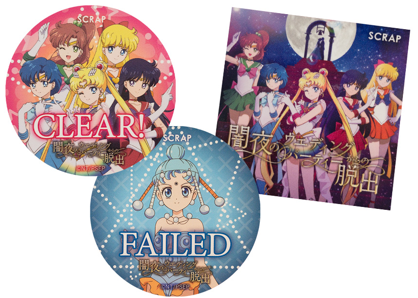 z napisem clear lub failed odnoszącym się do tego czy udało nam się pomyślnie ukończyć atrakcję, czy nie; kwadratowa ma wielkość 50 mm, a okrągła 55 mm; cena jednego zestawu to 300 jenów (ok. 11 zł). Obwoluta - format A5 z sylwetkami