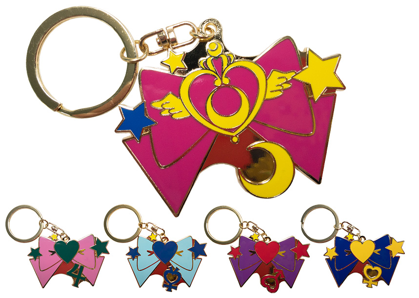 inner senshi; 500 jenów (ok. 18 zł). Podkładka z klipem - granatowa z sylwetkami inner senshi; format A5; 2000 jenów (ok. 70 zł). Metalowe breloki - zawieszka z kokardami i znakami planet inner senshi; do wyboru 5 wzorów; wymiary