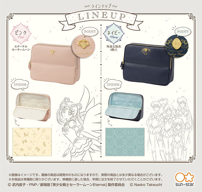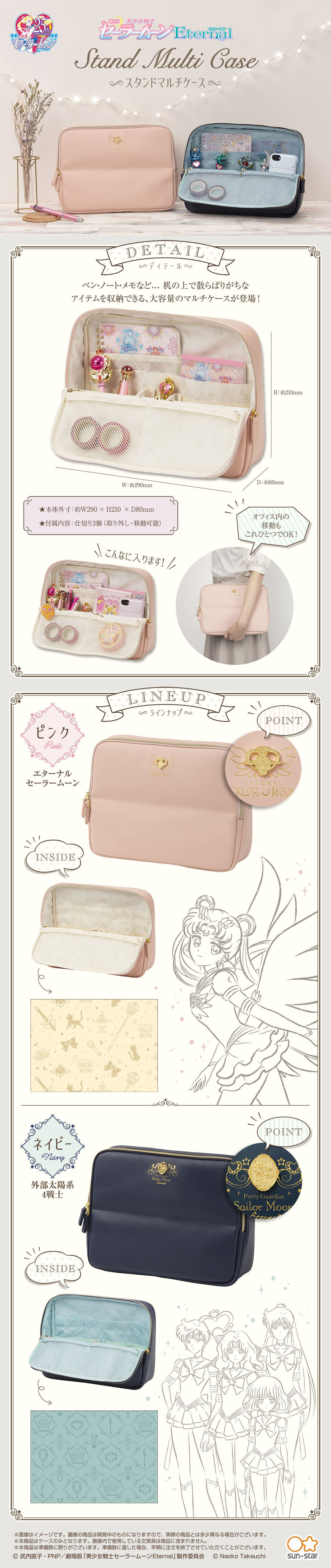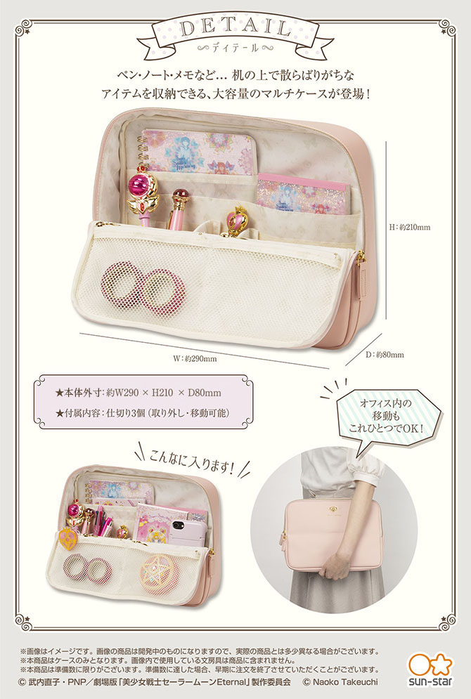 znajduje się wiele przegródek i kieszonek. Do wyboru są dwa kolory, różowy, inspirowany Eternal Sailor Moon oraz granatowy, inspirowany outer senshi. Wymiary to 290 x 210 x 80 mm, mieści format B5. Cena za sztukę to 3960 jenów (ok.