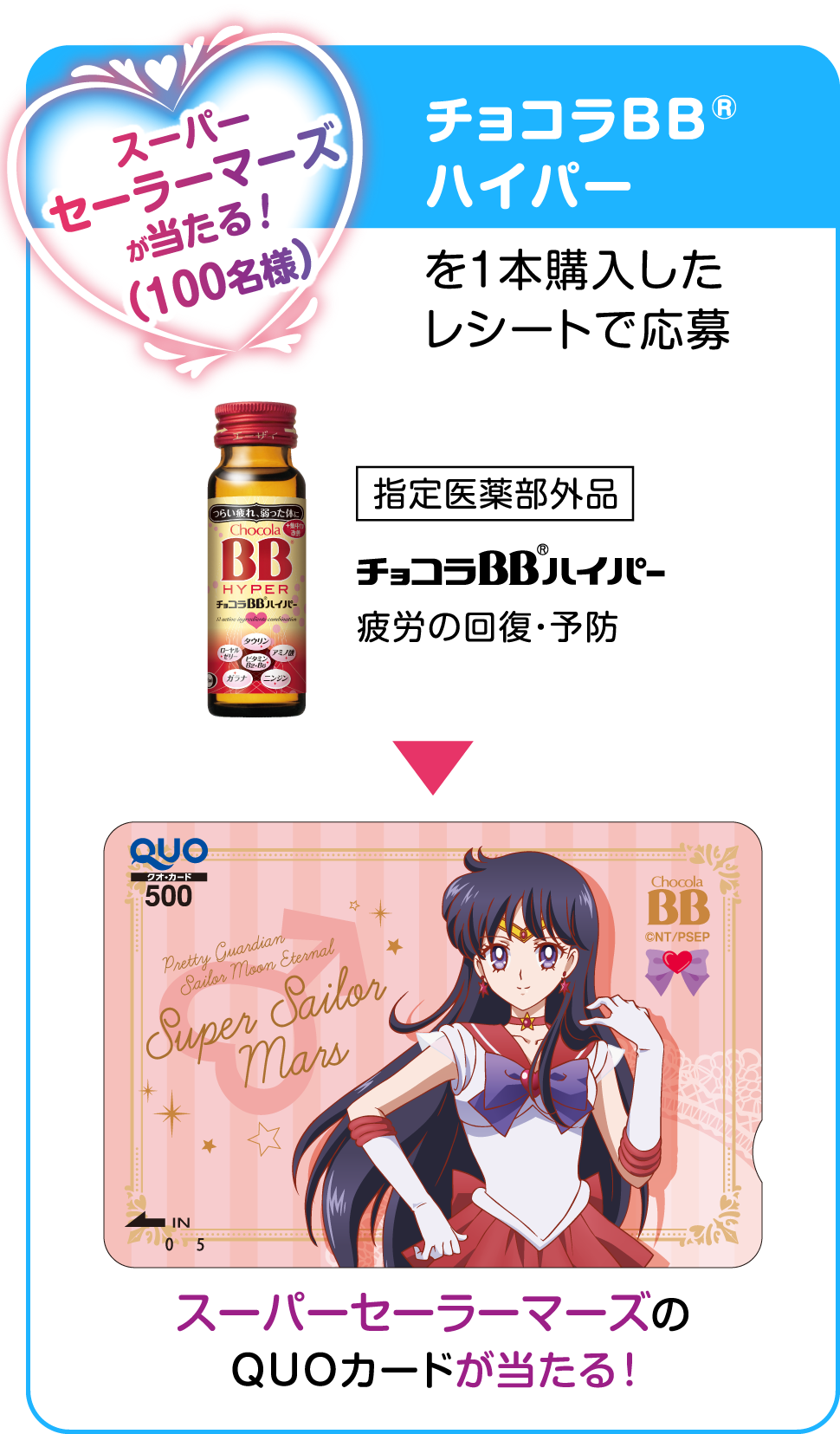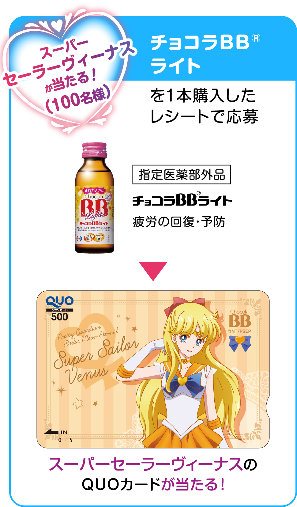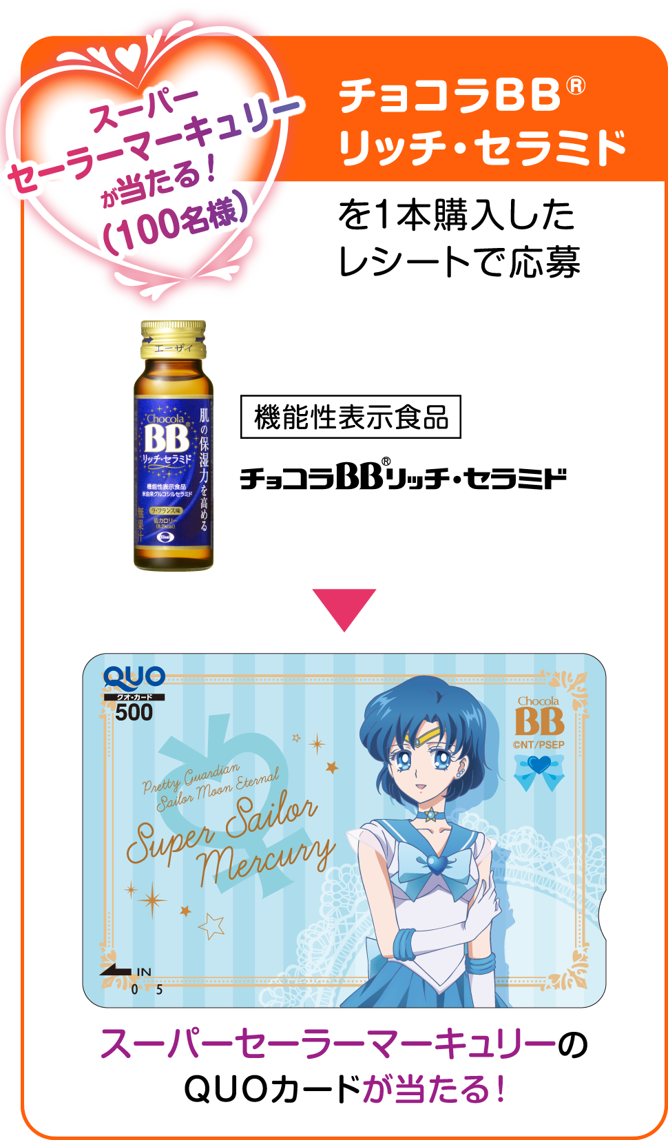2. Drugi sposób wzięcia udziału w kampanii to zakup jednego konkretnego produktu. Tutaj do wygrania są karty przedpłacone QUO o wartości 500 jenów. Karty mają grafikę z wojowniczkami, do wygrania jest 6 wzorów, 5 z inner senshi i 1 z Sailor Chibi Moon.