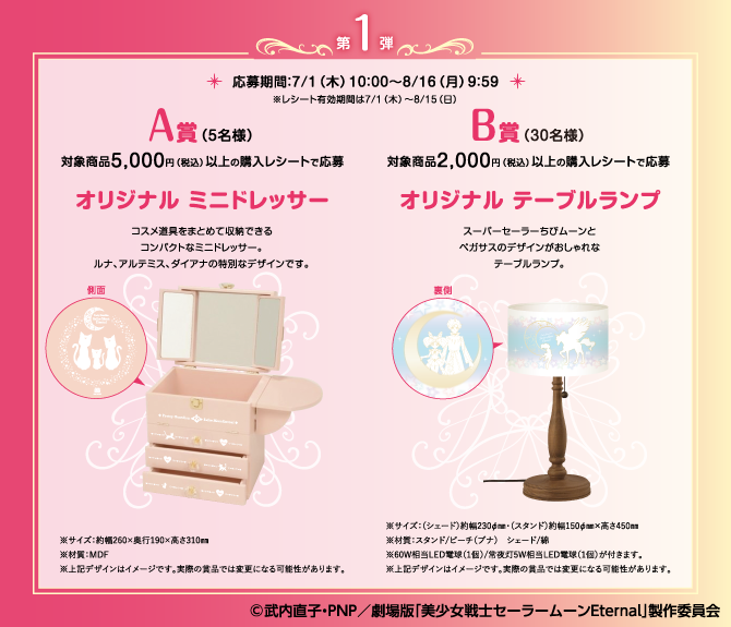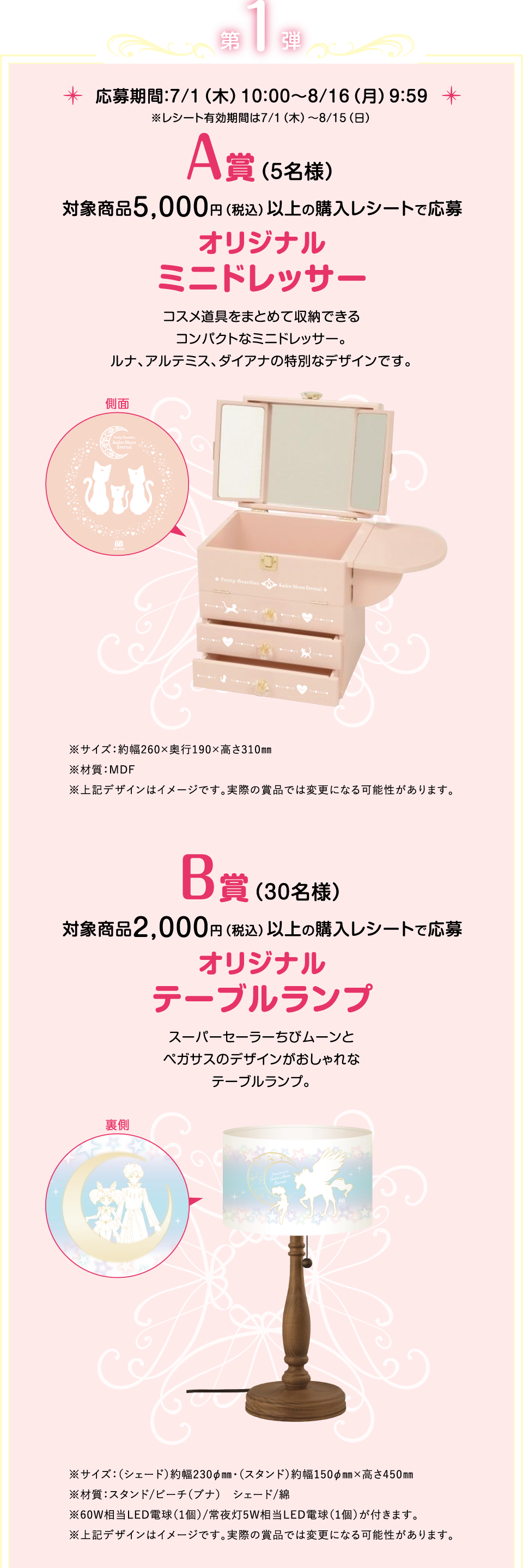 A. Zgłoszenie paragonu z zakupami na określoną kwotę. Można wziąć udział w loterii o nagrodę A lub B, aby móc wygrać nagrodę A należy zgłosić paragon o wartości przekraczającej 5000 jenów, a nagrodę B 2000 jenów. Nagroda A to duża kasetka na biżuterię,