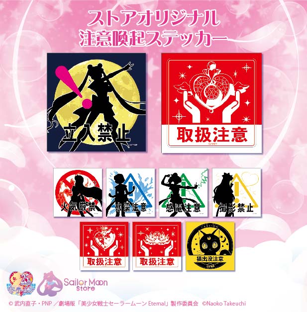 W Sailor Moon Store i Pretty Guardians pojawi się 9 wzorów naklejek ostrzegających przed zagrożeniem. Na naklejkach pojawiają się sylwetki inner senshi, Luna, broszki Crisis Moon Compact i Chibi Moon Compact oraz Srebrny Kryształ. Cena za sztukę to 550 jenów (ok. 20 zł). W sprzedaży będą dostępne jeszcze w lipcu.