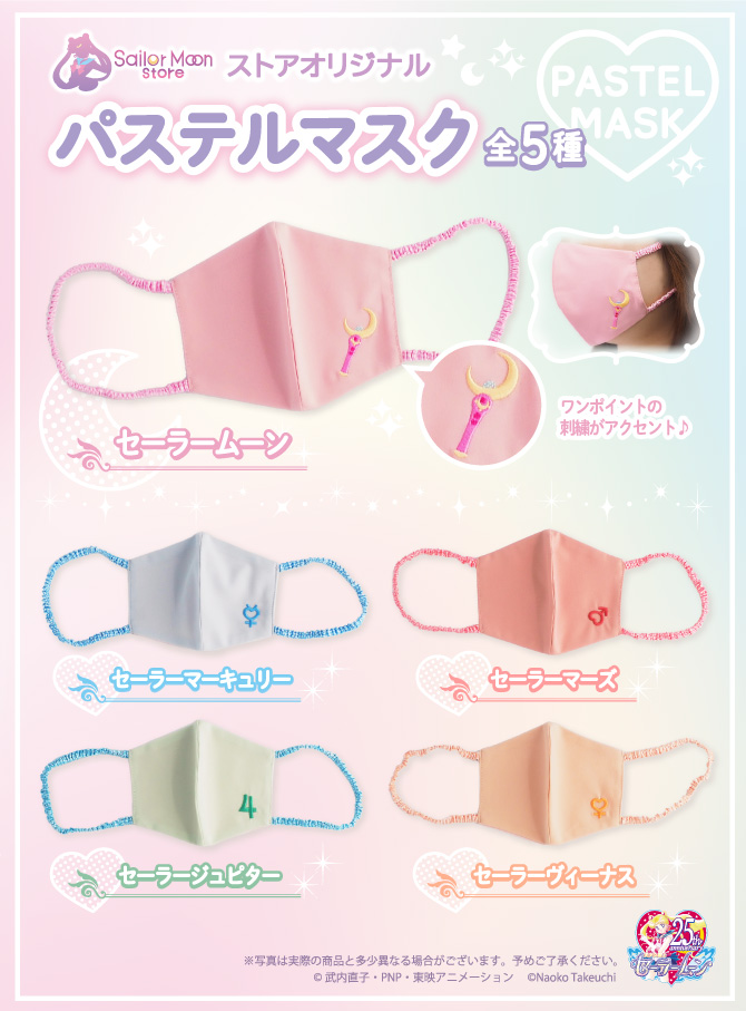 W Sailor Moon Store i Pretty Guardians pojawią się nowe maseczki ochronne. Tym razem do wyboru jest większa ilość wzorów. Maseczki są jednokolorowe i mają wyszywane wzorki z Moon Stick i znakami planet czterech inner senshi. W sumie pięć wersji kolorystycznych do wyboru. Cena za sztukę to 1650 jenów (ok. 59 zł). W sprzedaży będą dostępne w sierpniu.