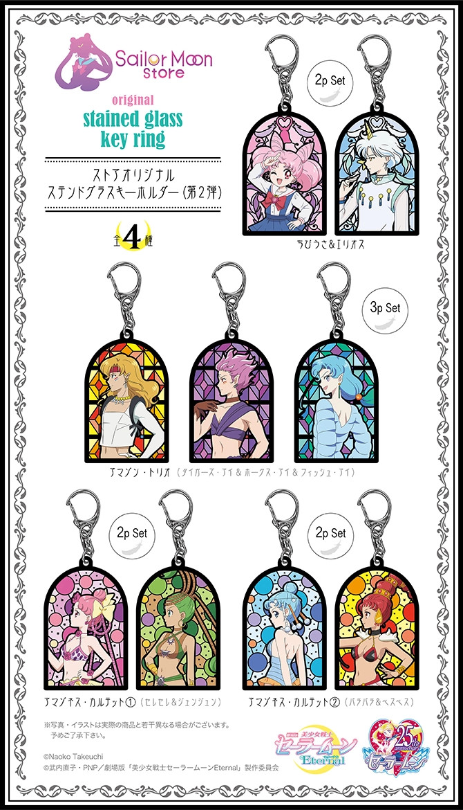 W Sailor Moon Store i Pretty Guardians pojawią się zestawy breloków witrażowych. Do wyboru będą 4 zestawy: Chibiusa i Helios, Amazon Trio, Cere Cere i Jun Jun oraz Palla Palla i Ves Ves. Zestaw Amazon Trio kosztuje 2640 jenów (ok. 93 zł), a pozostałe po 1760 jenów (ok. 62 zł). W sprzedaży będą dostępne od 12 sierpnia.