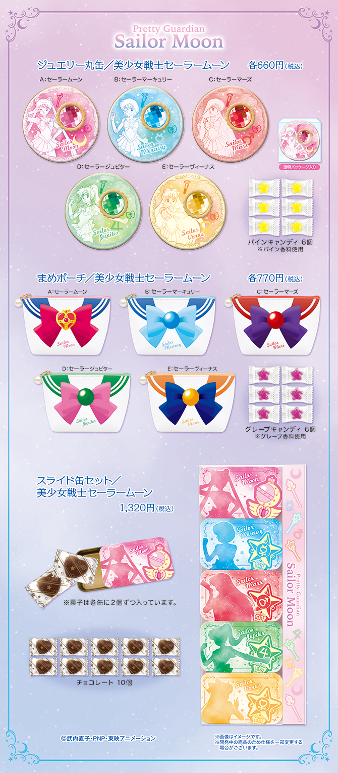 czekoladki z białej czekolady z nadrukiem czterech wojowniczek, jedna okrągła czekoladka z białej czekolady z nadrukiem Sailor Moon i jedna czekoladka w kształcie lakieru do paznokci; 1620 jenów (ok. 56 zł).