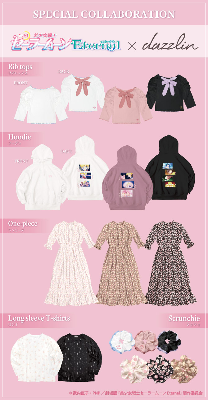 Hoodie - bluzy z kapturem; z przodu różne sceny z filmów Eternal; dostępne w kolorach białym, ciemno-różowym oraz czarnym; 9900 jenów (ok. 348 zł) za sztukę.