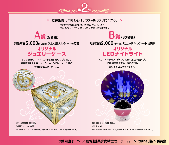 5000 jenów, a nagrodę B za przynajmniej 2000 jenów. Do wygrania jest 5 sztuk szkatułek na biżuterię oraz 30 sztuk lamp nocnych.