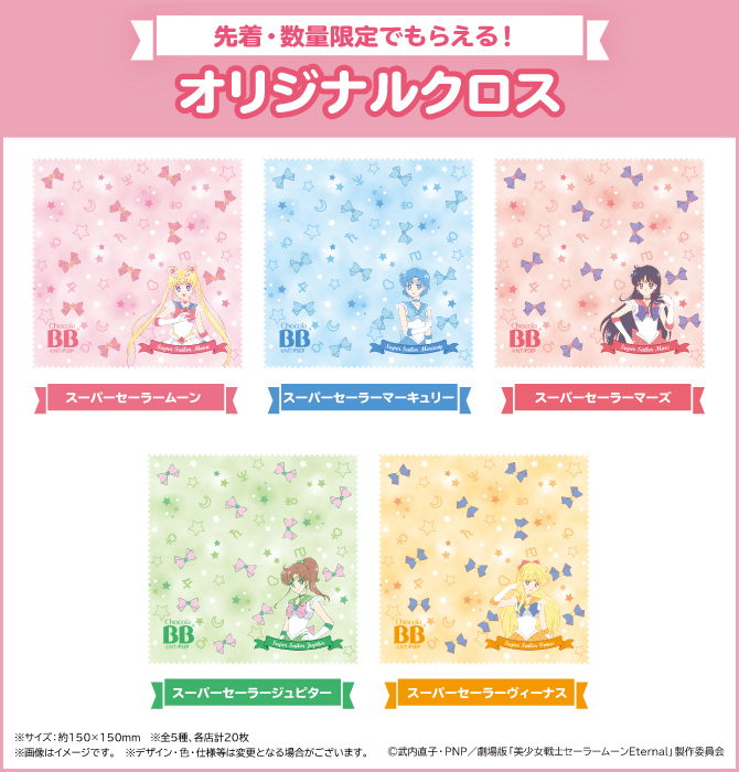 Osoby, które kupią dwa z czterech dedykowanych napojów z serii Chocola BB, otrzymają materiałową chusteczkę. Do uzbierania 5 wzorów z każdą z inner senshi.
