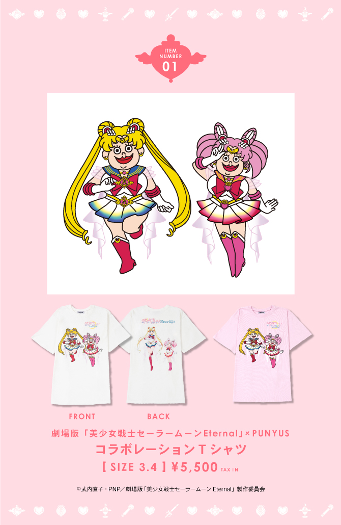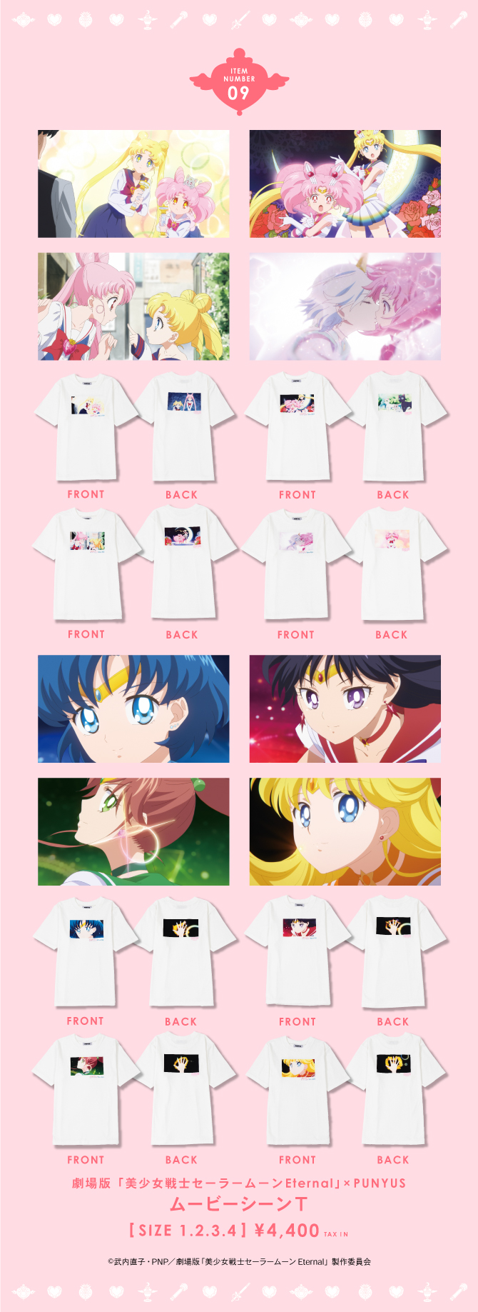 Koszulki - z przodu nadruk z Super Sailor Naomi Moon i Super Sailor Chibi Naomi Moon, a z tyłu nadruk z Super Sailor Moon i Super Sailor Chibi Moon; do wyboru kolor biały lub różowy; dostępne rozmiary to 3 i 4; cena za sztukę to 5500 jenów (ok. 193 zł).