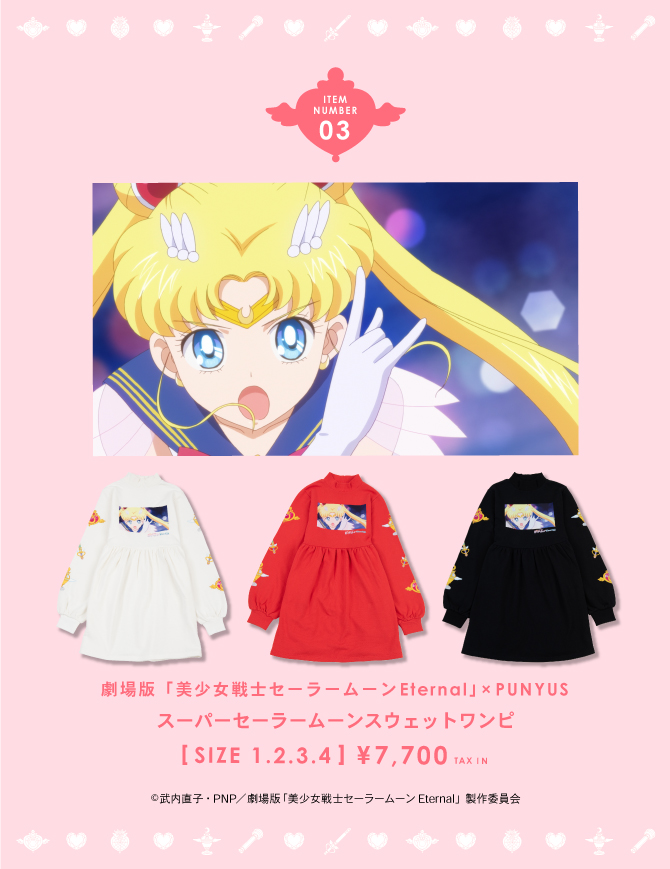 Super Sailor Chibi Moon Sweat One Piece - jak wyżej, ale z nadrukami Super Sailor Chibi Moon; dostępne kolory to biały, różowy i czarny.