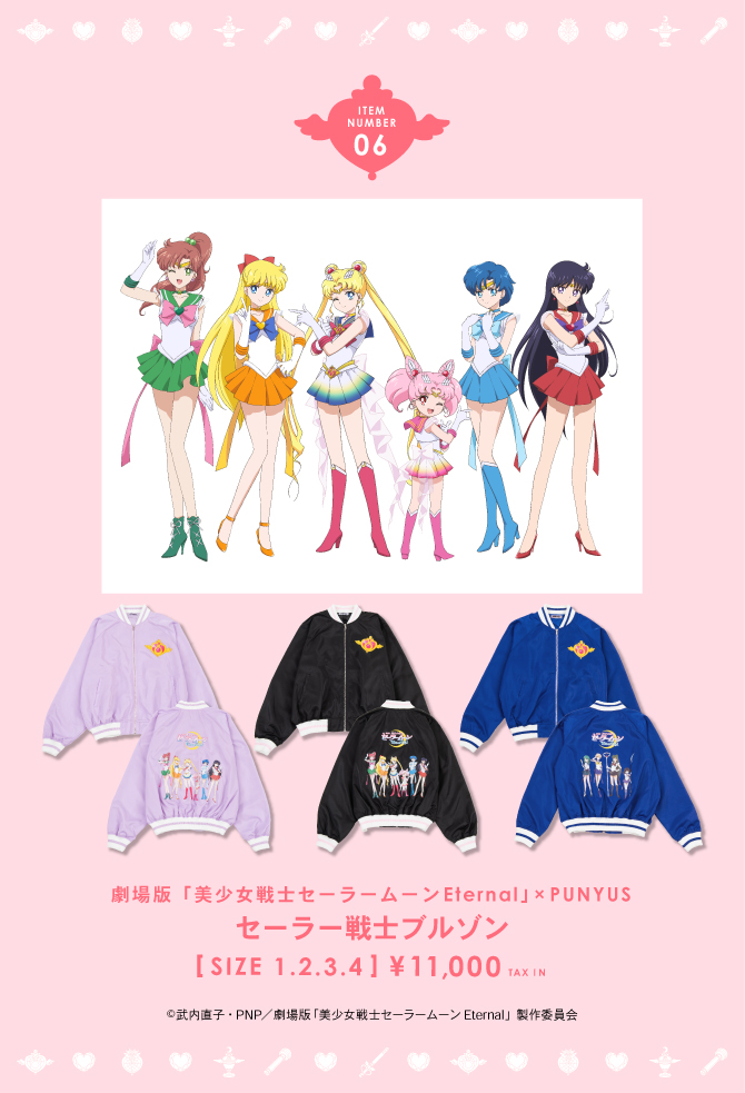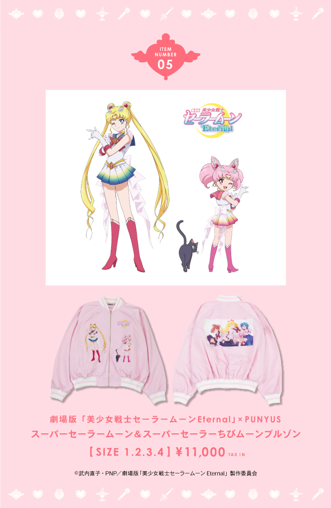 Super Sailor Moon & Super Sailor Chibi Moon Blouson - różowa bluza z nadrukami, z przodu nadruk Super Sailor Moon, Super Sailor Chibi Moon i Luną, a na plecach scena z filmu; dostępne rozmiary to 1, 2, 3 i 4; 11 000 jenów (ok. 385 zł).