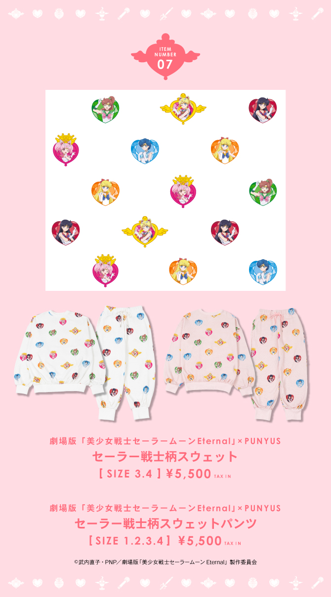 Sailor Senshi gara Sweat/Sweat Pants – bluza i spodnie dresowe z nadrukiem na całej powierzchni; na nadruku pojawiają się inner senshi i Sailor Chibi Moon na tle swoich broszek; do wyboru biały lub jasno-różowy kolor materiału; bluzy dostępne są w rozmiarach