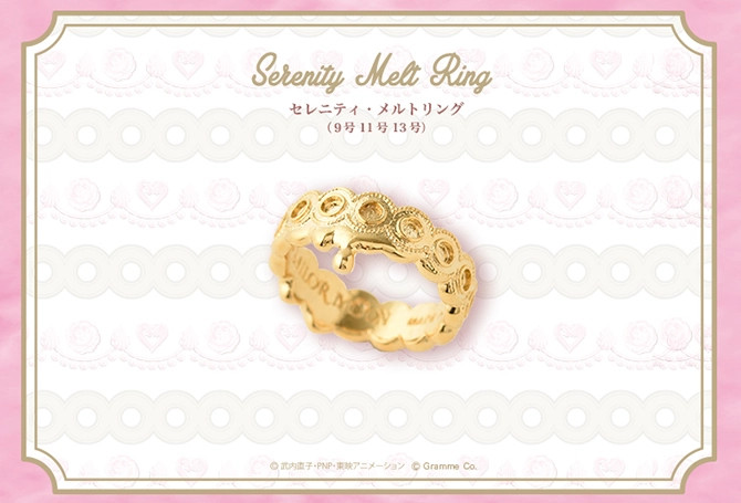 Serenity Melt Ring - obrączka w kolorze złotym z motywem kół z sukienek Księżniczek; z jednej strony pierścionek wygląda, jakby się topił; dostępne rozmiary to 9, 11 i 13; 13 200 jenów (ok. 462 zł).