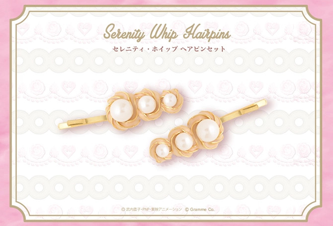 Serenity Whip Hairpins - wsuwki do włosów w kolorze złotym, ozdobione perełkami w trzech rozmiarach; mają przypominać ozdoby, które noszą we włosach Księżniczki; 14 300 jenów (ok. 501 zł) za komplet dwóch sztuk.