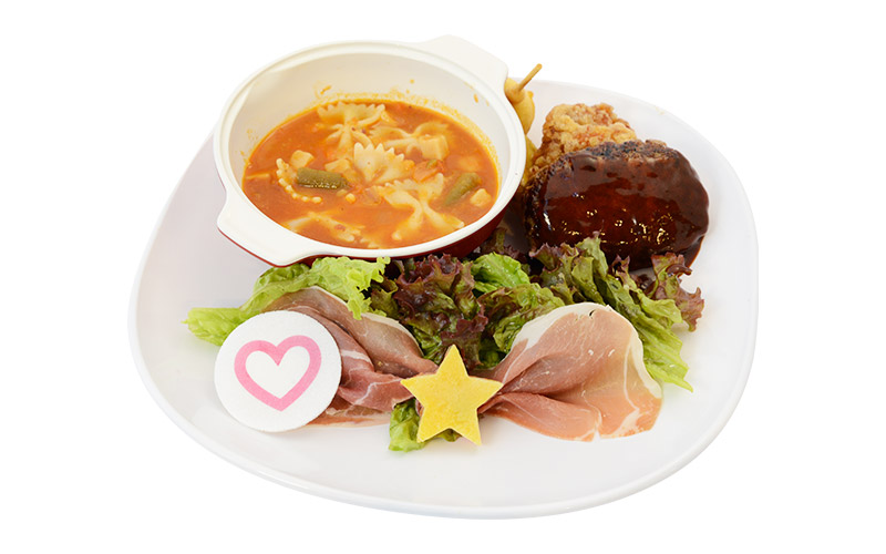 dziesięć wzorów podkładek. Dania serwowane w restauracji to potrawka, carbonara lub omlet w cenie 1600 jenów (56 zł) za danie oraz power plate inspirowany outer senshi w cenie 2000 jenów (ok. 70 zł). Do wyboru są dwa ciepłe napoje,